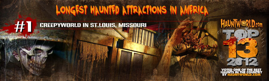 1. Creepyworld Haunted ScreamPark in St Louis, Missouri www.scarefest.com Creepyworld is a massive haunted screampark with nine attractions in one location. For one price, Creepyworld includes a zombie paintball hayride, Route 666 Drive Inn movie theater, Twisted Torture 3D haunted house, Hornbuckle’s hogs and cornmaze, Silo-X and more! Creepyworld takes well over an hour to complete.