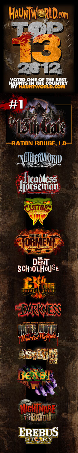 2. 13th Gate in Baton Rouge, LA www.midnightproduction.com A case can be made that this attraction is in fact the most detailed haunted house in America. The set design is really second to no haunted house in America. Going here is like being in a real movie.